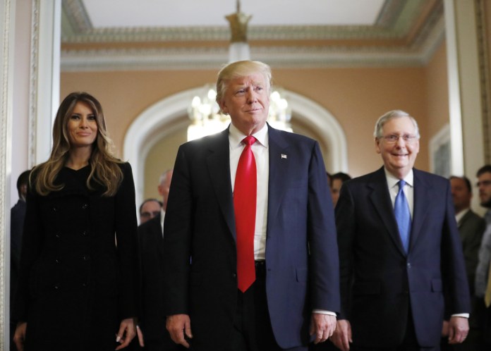 Ông Donald Trump cùng vợ (trái) đến thăm Quốc Hội hôm Thứ Năm. Bên phải là Thượng Nghị Sĩ Mitch McConnell. (Hình: AP Photo/Alex Brandon
