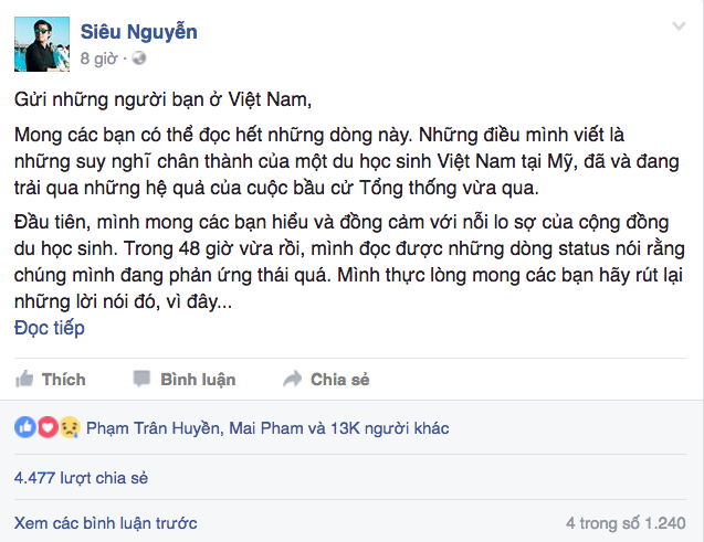 Mình viết status này không phải để chỉ trích các bạn. Những suy nghĩ, những lời nói của các bạn ĐỀU RẤT ĐÁNG TRÂN TRỌNG, nhưng ngay lúc này, du học sinh tại Mỹ mới là những người bị ảnh hưởng nhiều nhất, nên thay vì cố gắng phân tích, giải thích tại sao Trump thắng, hay phản đối quan điểm của ai đó, các bạn nên dành thời gian để hỏi thăm, để quan tâm tới những người đang phải tận mắt chứng kiến hệ quả của cuộc bầu cử này.