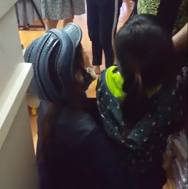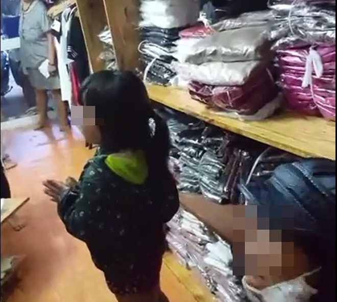 Chị ta còn kéo đứa con nhỏ tới xin chủ cửa hàng tha tội. (Ảnh cắt từ clip)