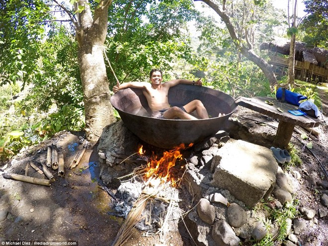 “Bồn tắm” là vật dụng giống như một chiếc nồi khổng lồ, đặt trên bếp kê bằng đá. Du khách ngồi tắm bên trong chiếc nồi này trong khi ngọn lửa to bên dưới sẽ làm nước nóng dần dần. Ảnh: Michael Diez/Mediadrumword.