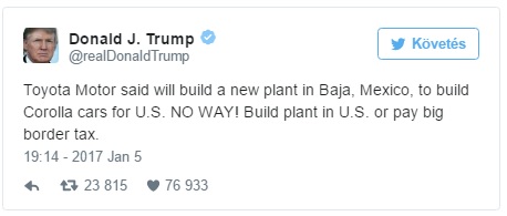 Công ty Toyota đang có kế hoạch xây nhà máy tại Baja, Mexico. Hãng sản xuất xe hơi lớn nhất Nhật Bản này đã bị ông Trump, tân tổng thống đắc cử cảnh cáo ngay lập tức trên twitter. Ông Trump viết như sau:"