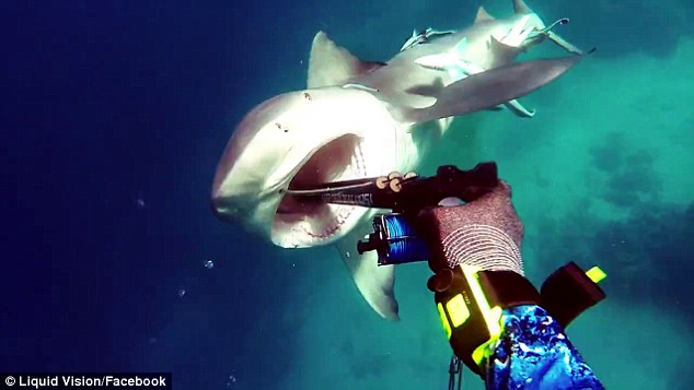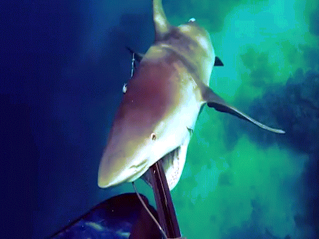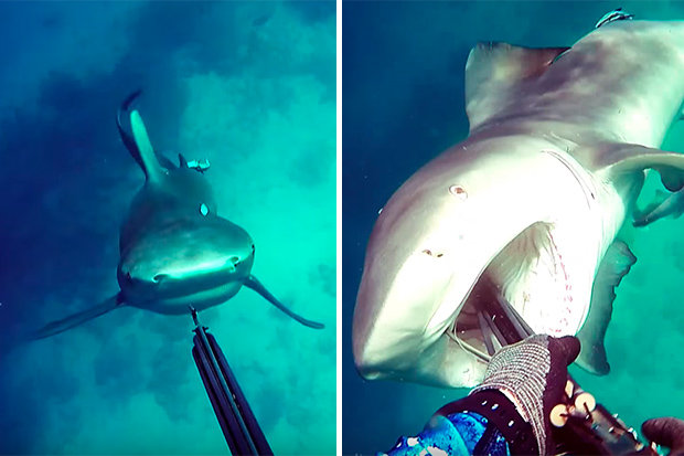 Con cá mập ḅ hung hăn bị thợ lặn dùng súng phóng giáo đâm vào mồm.