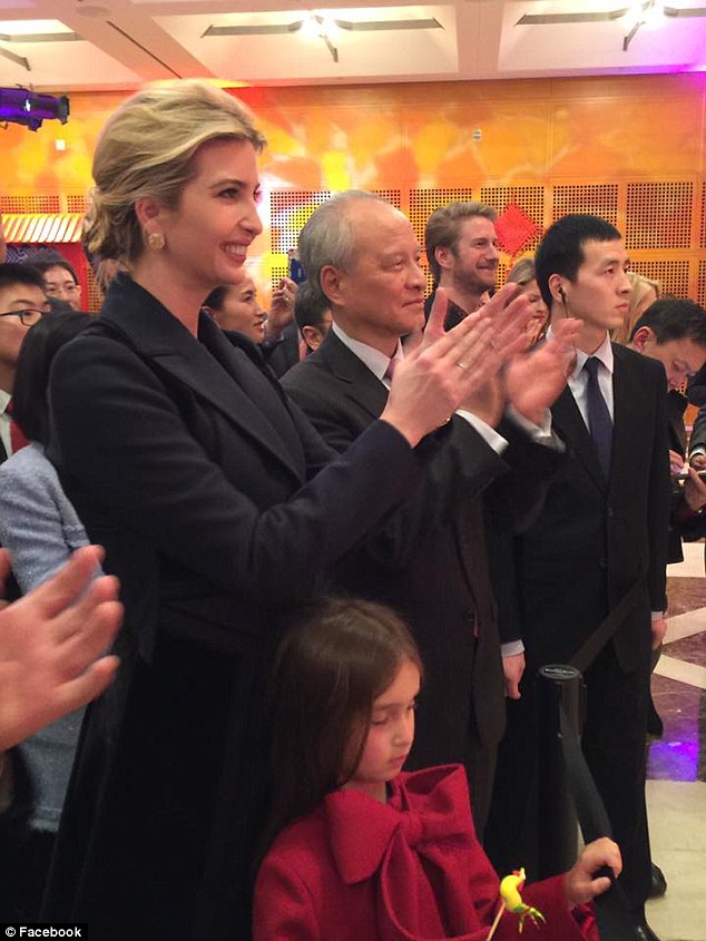 Ivanka Trump mặc đồ tối màu, nắm tay con gái 5 tuổi Arabella, nhanh chóng đi vào phòng tiệc cùng đại sứ Trung Quốc tại Mỹ Cui Tiankai. Khi được một người dự tiệc hỏi về đệ nhất tiểu thư nhà Trump, ông Cui nói: "Cô ấy rất thích Trung Quốc".