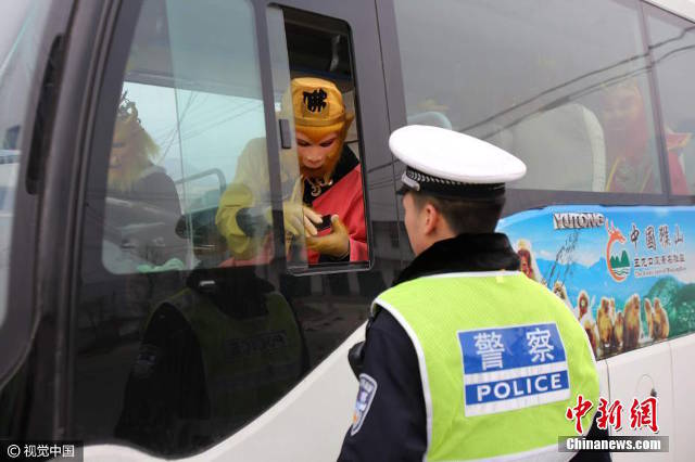 “Tôn Ngộ Không” đang lái một chiếc xe chở cả đoàn “Tây Du Kí” thì bị yêu cầu dừng lại ở một trạm kiểm soát ở thành phố Tế Nguyên, tỉnh Hà Nam, Trung Quốc.