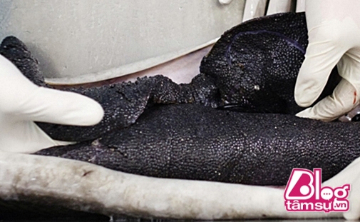 Những mảng đen thui này đóng thành từng cục lớn. Đến khi tách ra thì rơi thành từng hạt nhỏ. Thực ra đây chính là trứng cá tầm, chứa rất nhiều dinh dưỡng nên được người dân châu Âu ưa thích.