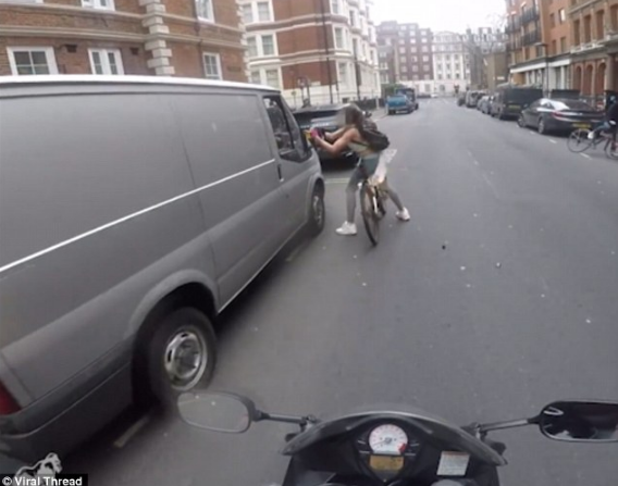 Các cô gái đi xe đạp dễ là mục tiêu trêu ghẹo của những gã đi đường. Trong clip sau đây cũng vậy nhưng là cách cô gái trả thù. Cô gái đã bẻ gương của chiếc xe rồi ném ra đường.