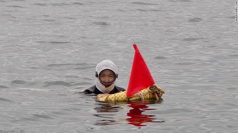 Bên trong phao là một tấm lưới, được gọi là sukari, chứa đầy hải sâm. Ngay lúc đó, một người phụ nữ từ dưới biển trồi lên. Bà hít thở và bắt đầu huýt một tiếng sáo lanh lảnh.