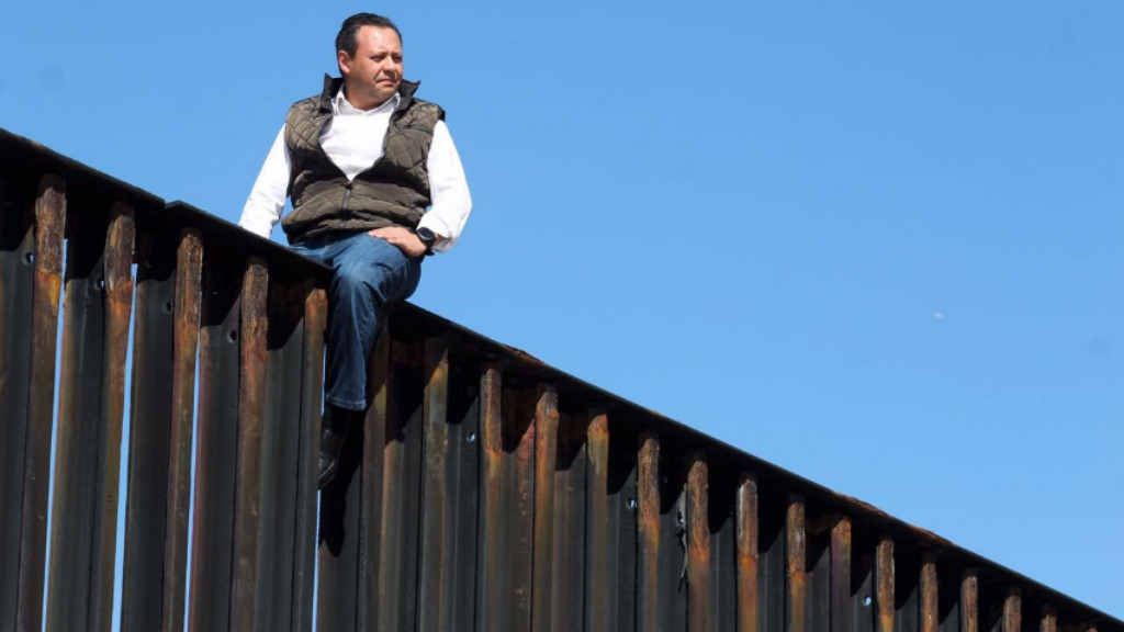 Nghị sĩ Braulio Guerra ngồi trên tường rào ngăn giữa Mexico và Mỹ