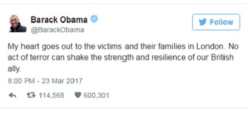 "Tôi xin bày tỏ lòng tiếc thương những nạn nhân và gia đình gặp nạn ở London. Không hành động khủng bố nào có thể làm lung lay sức mạnh và sự lạc quan của người Anh, đồng minh của chúng tôi", ông Obama viết lúc 20h ngày 23/3.