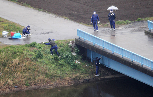Các nhà điều tra tại hiện trường nơi phát hiện thi thể Lê Thị Nhật Linh. Ảnh: Mainichi