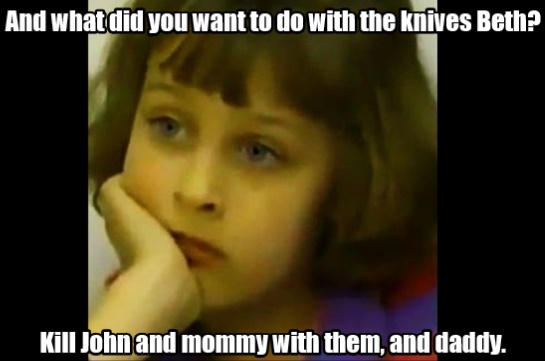 Cuộc nói chuyện được ghi hình với chuyên gia tâm lý, bé lạnh lùng, vô cảm trả lời rằng đã lên kế hoạch giết em John, mẹ và cha bằng con dao đã lấy trộm của gia đình.