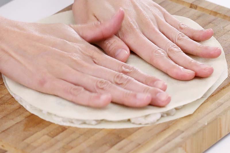 Dùng một cái bánh tráng khác, đặt lên mặt bánh vừa thêm nhân xong.