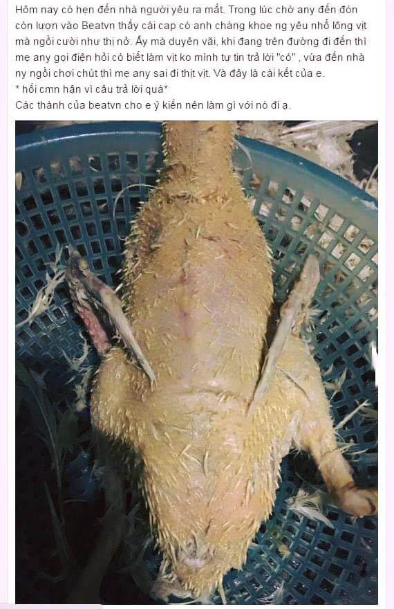 Mới đây, một cô gái trẻ xinh đẹp đã chia sẻ hình ảnh quá trình mình vào bếp vặt lông vịt kèm bình luận: "Vụng lắm, có biết nấu nướng gì đâu mà bắt em vào bếp nhổ lông vịt". Kèm theo đó là hình ảnh chú vịt được vặt lông kỹ tới mức lột hết cả da trông rất thảm thương và kém đẹp mắt.