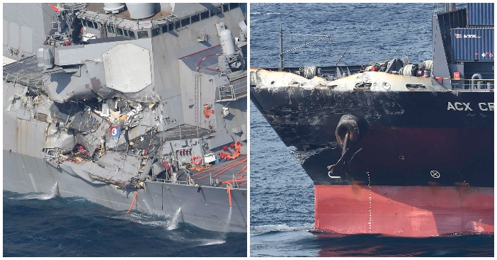 Tàu khu trục Fitzgerald của Mỹ (trái) và tàu chở hàng của Philippines sau vụ va chạm sáng sớm ngày 17/6/2017.