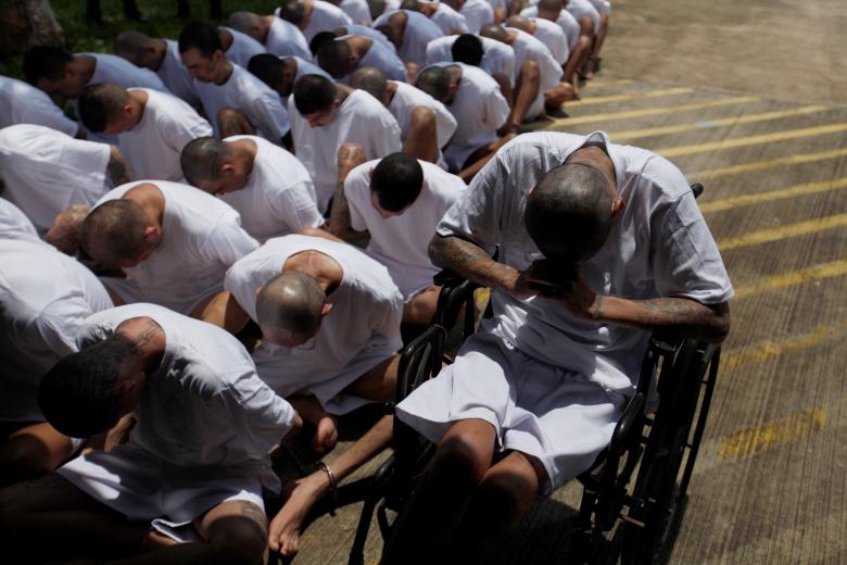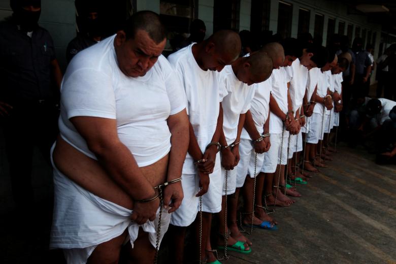 Thành viên MS-13 ngồi xếp thành hàng dưới đất, tay còng ra sau, mặt cúi gằm. Một số tên tội phạm còn xăm chữ MS nhìn thấy rõ trên đầu.