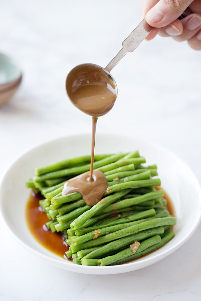- Khi ăn, rưới hỗn hợp sốt mè lên trên đậu đũa.