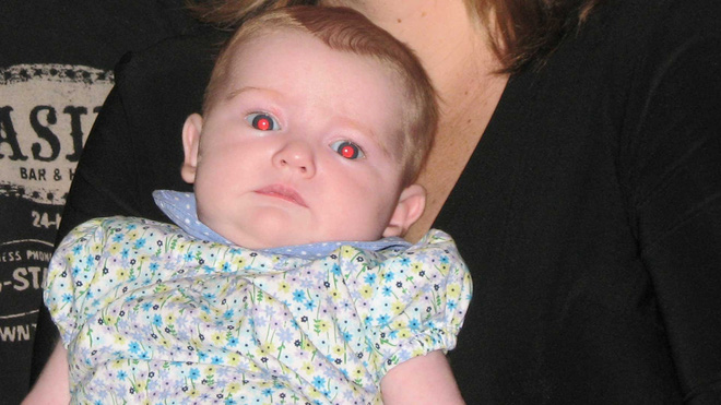 Hiện tượng mắt đỏ rất dễ thấy trong những tấm ảnh chụp có flash vào buổi tối, như ví dụ dưới đây:
