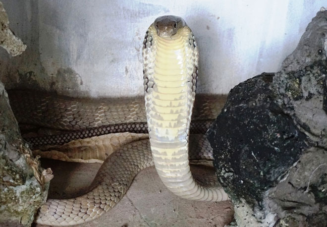 Theo trung tá Lương dù được chăm sóc trong môi trường nuôi nhốt nhưng bản tính thú dữ nên hổ mang chúa vẫn còn, khi thấy có người đến gần rắn sẽ dựng ngược cơ thể phùng mang. Vì vậy việc chăm sóc, cho rắn độc ăn phải hết sức cẩn thận.
