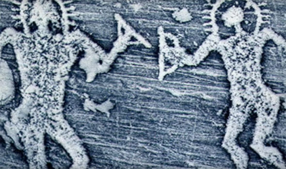 Theo một vài người, những bức tranh bí ẩn này được gọi là petroglyphs mô tả hai người đàn ông đội những chiếc mũ bảo hiểm với những vũ khí rất kỳ lạ.