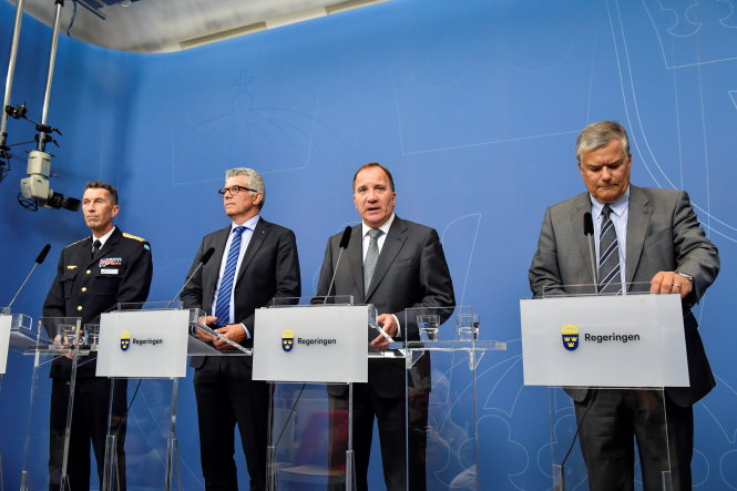 Từ trái sang: Tư lệnh tối cao các lực lượng vũ trang Thụy Điển, tướng Micael Byden; Tổng giám đốc Cảnh sát an ninh Anders Thornberg; thủ tướng Stefan Lofven và Tổng giám đốc Cơ quan Vận tải Thụy Điển Jonas Bjelfvenstam trong cuộc họp báo tại thủ đô Stockholm, ngày 24-7 về vụ lộ mật.