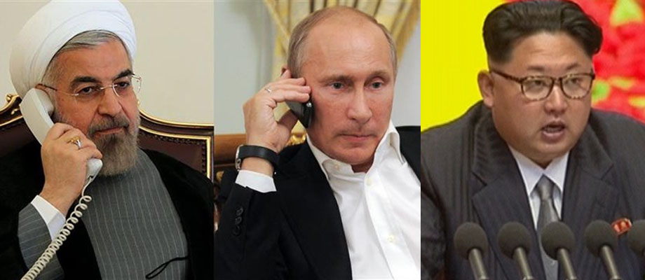 Iran, Nga, Triều Tiên đã có những bước đi đầu tiên đáp trả các lệnh trừng phạt mới của Mỹ. Trong ảnh, từ trái qua phải: Tổng thống Iran Hassan Rouhani, Tổng thống Nga Vladimir Putin và lãnh đạo Triều Tiên Kim Jong-un
