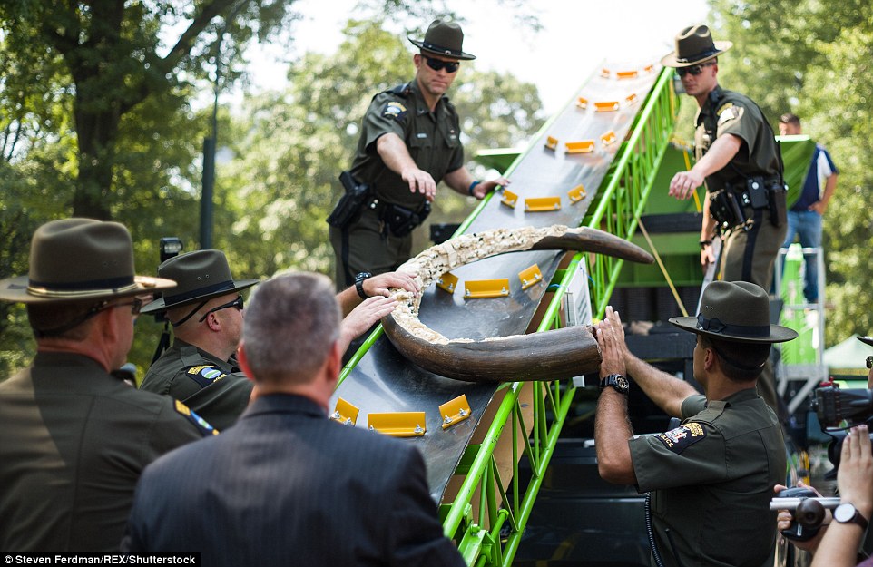 Thật xót cả ruột nhưng Mỹ vẫn phải làm việc này. Đó là nghiền nát khoảng 2 tấn ngà voi. Đây là những tác phẩm từ ngà voi được chế tác hết sức tinh xảo. Những tác phẩm này bị tịch thu từ những vụ buôn lậu ngà voi từ khắp nước Mỹ.