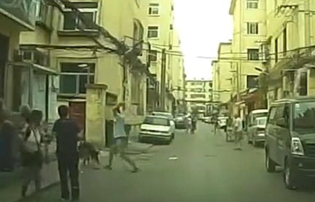 Sự việc mới xảy ra tại khu dân cư thuộc địa phận thành phố Thái Nguyên, tỉnh Sơn Tây, Trung Quốc và được ghi lại bởi máy quay giám sát hành trình trên một chiếc xe hơi.