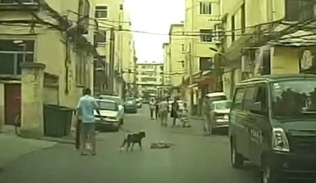 Hạ gục con chó hoang, người đàn ông nói trên định kéo thú cưng bỏ đi. Nhưng khi thấy đám đông ý kiến thì ông ta đành trở lại hiện trường, dùng chính tấm ván gỗ ban nãy để gạt loài động vật đáng thương vào lề đường.