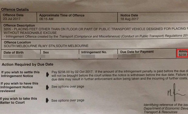“Chào mọi người, em bị đóng phạt 240 AUD vì gác chân lên ghế trên tàu điện. Họ nói em chỉ bị cảnh cáo vì lần đầu mà ai ngờ bị gửi giấy đóng phạt. Em mới qua bên này nên còn non dại đâu có biết gì về luật đâu.
