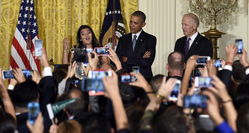 Tổng thống Barack Obama và Phó Tổng thống Joe Biden lắng nghe nữ sinh viên Diana Calderon, người thụ hưởng chương trình DACA, phát biểu tại Nhà Trắng ngày 15-10-2015. Ảnh: AP