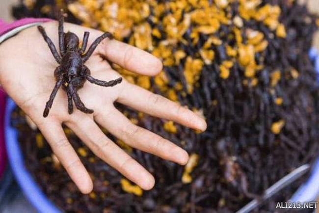 Nhện chiên của Campuchia: Loài nhện màu đen, có lông dài và có độc này có tên gọi là Tarantula. Chúng thường sống trong các lỗ sâu khoảng nửa mét. Người Campuchia chế biến món này bằng cách thêm hành, muối và một số gia vị khác, sau đó chiên ngập dầu, vậy là chúng ta đã có một món ăn vừa thơm vừa giòn cực kỳ ngon.