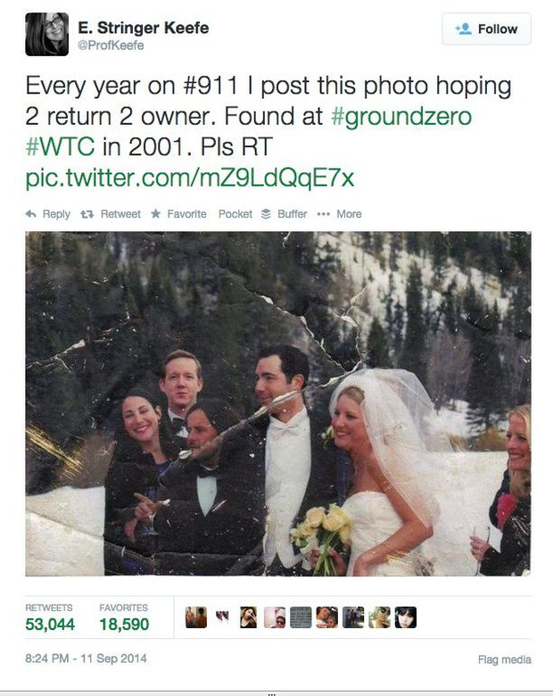 Đã 16 năm trôi qua, vụ tấn công kinh hoàng 11/9 vào tòa tháp đôi năm nào vẫn là những ký ức ám ảnh đối với người dân trên toàn thế giới. Đối với Elizabeth Stringer Keefe, bên cạnh nỗi đau chung với người dân nước Mỹ, cô còn đau đáu bởi số phận của những người hiện diện trong một tấm ảnh cưới cũ kỹ được tìm thấy tại hiện trường tan hoang của cuộc tấn công.