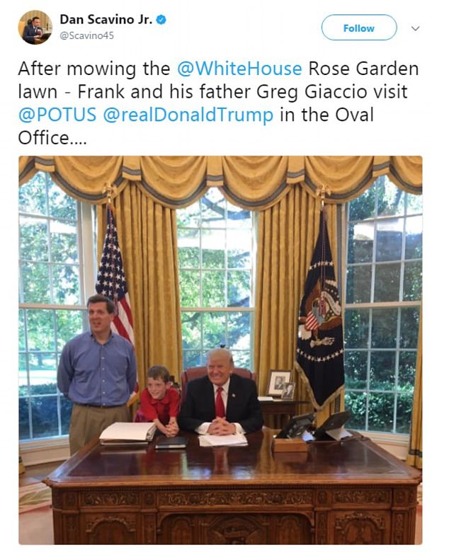 TT Trump vừa đón một vị khách đặc biệt, một cậu bé 11 tuổi. Đó là cậu bé đã viết thư cho ông Trump bày tỏ lòng ngưỡng mộ và mong muốn được cắt cỏ trong Nhà Trắng. Cậu đã được chấp nhận và được ông Trump đã khen ngợi và nói rằng cậu sẽ có thể trở thành tổng thống Mỹ trong tương lai.
