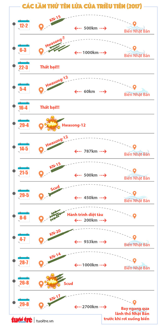 Ngày 29-8, một tên lửa Hwasong-12 khác đã được phóng đi với khoảng cách 2.700km và cũng bay ngang lãnh thổ Nhật Bản.