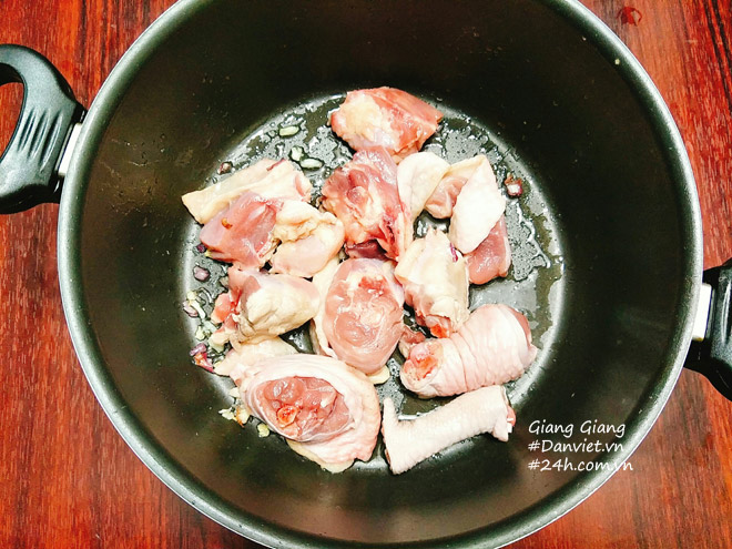 - Bước 3: Sử dụng luôn chảo đó để kho, cho 1 chút dầu ăn vào chảo và cũng phi hành tỏi cho thơm, tiếp theo bạn cho thịt gà vào đảo đều, nêm chút nước mắm, muối, tiêu, bột ngọt rồi xào cho tới khi gia vị rút hết vào thịt.