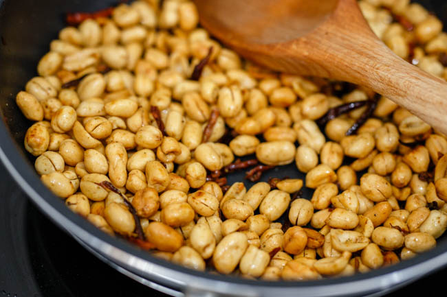 Cho một ít dầu vào chảo, thêm ớt khô, tiêu Tứ Xuyên (không có cũng được) vào đảo cho thơm. Cho lạc vào, thêm muối, ngũ vị hương, tiêu, đường, tiêu trắng, rang đều cho gia vị ngấm đều vào lạc là được.
