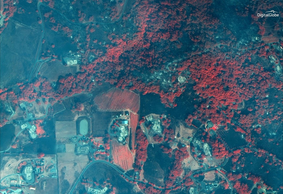 Những hình ảnh này được vệ tinh WorldView-3 và GeoEye-1 ghi lại. Trước đó, ngọn lửa bùng phát từ tối 8/10 và càn quét hơn 46.000 ha đất đai ở thung lũng Napa, vùng sản xuất rượu vang nổi tiếng của Mỹ.