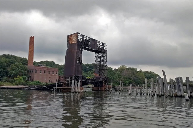 Từ bờ tây của đảo North Brother, du khách có thể thấy cây cầu nổi tiếng Hell Gate bắc qua sông Đông.