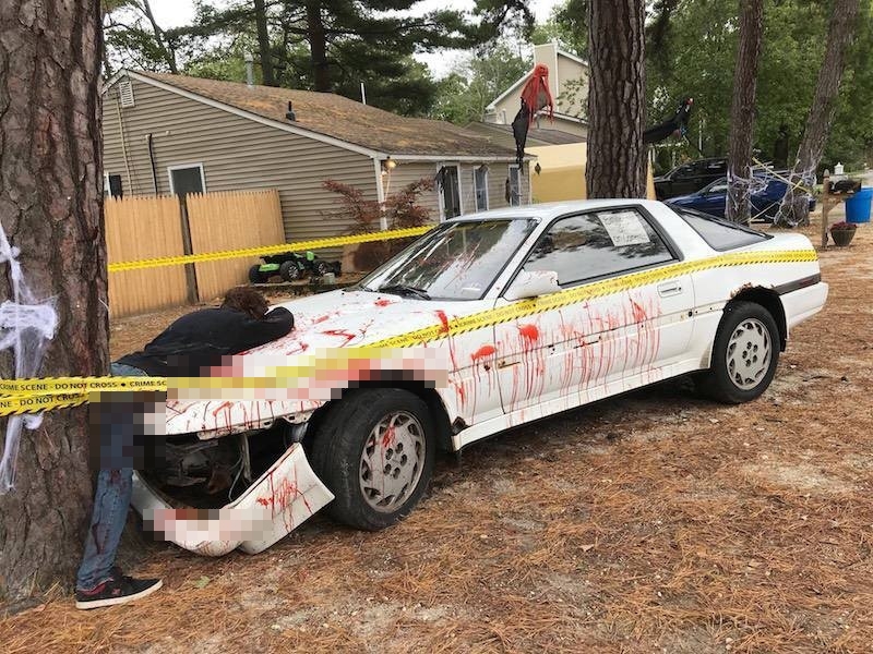 Khi đi ngang qua sân gia đình này, những người đi đường đã hết sức sợ hãi khi thấy cảnh tượng một vụ tai nạn giao thông nghiêm trọng: Người đàn ông bị chiếc ô tô đâm ngang người, cắm vào gốc cây, máu me vương vãi khắp nơi, lại còn có những dải băng phân cách. Ngay lập tức, họ đã gọi điện báo cho cảnh sát địa phương tới. Tuy nhiên khi tới nơi, tất cả mới vỡ lẽ đó chỉ là đồ trang trí Halloween. Chủ nhà, anh Krysten Negrotto giải thích: