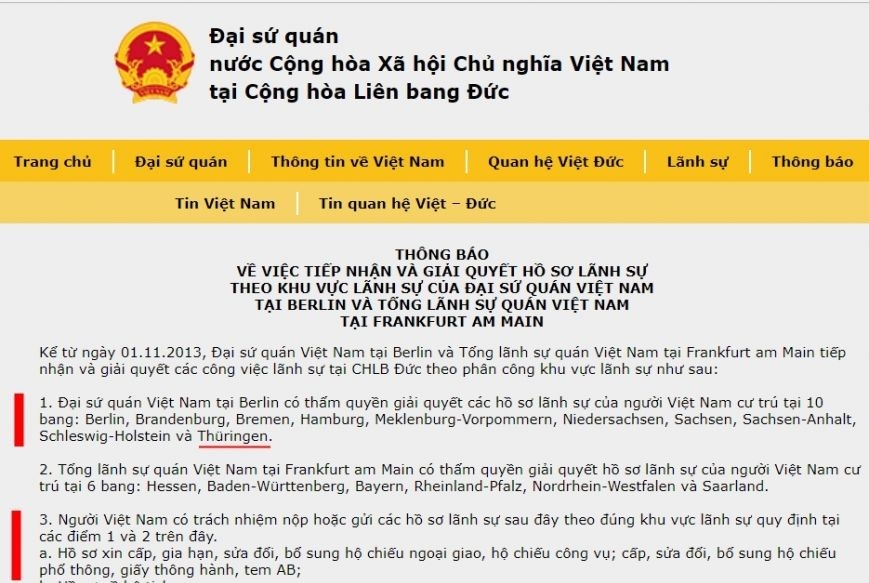 Ảnh chụp màn hình Thông báo của ĐSQ VN ở Berlin về phân chia khu vực lãnh sự giữa Đại sứ quán ở Berlin và Tổng Lãnh sự quán ở Frankfurt am Main
