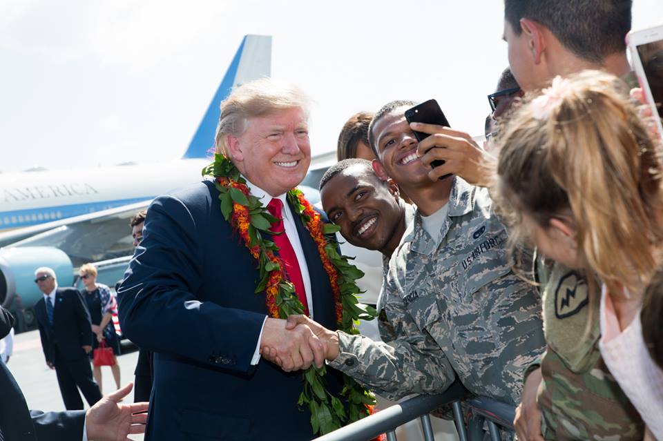 Trước khi đến thăm các quốc gia ở Châu Á, Tổng thống Trump và phu nhân Melania đã đến thăm đảo Hawaii. Những người dân ở đây đã rất vui mừng khi được chào đón Tổng thống. Tổng thống Trump và phu nhân Melania gần gũi, nhiệt tình chụp ảnh selfie với binh sỹ và người dân ở Hawaii.