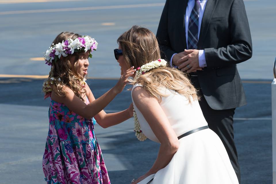 Một bé gái đeo vòng hoa truyền thống của đảo Hawaii cho Đệ nhất phu nhân tại sân bay. (Ảnh: White House)