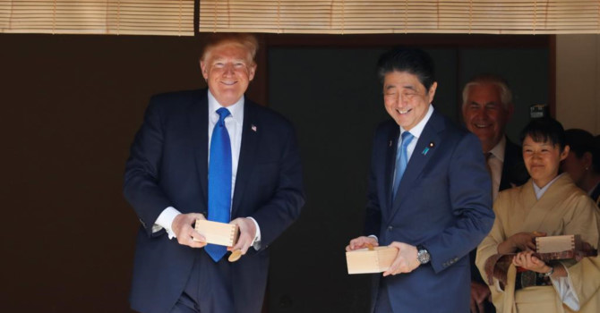 Tổng thống Mỹ Donald Trump (T) và Thủ tướng Nhật Shinzo Abe nhận quà tặng của nước chủ nhà trước buổi làm việc. Ảnh tại dinh Akasaka, Tokyo, ngày 6/11/2017. Ảnh REUTERS/Jonathan Ernst