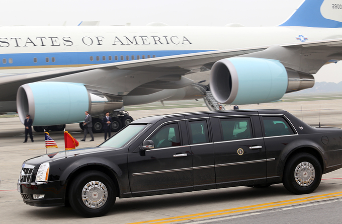 Hai chiếc Cadillac "Quái thú" tiến vào nơi đậu Air Force One.