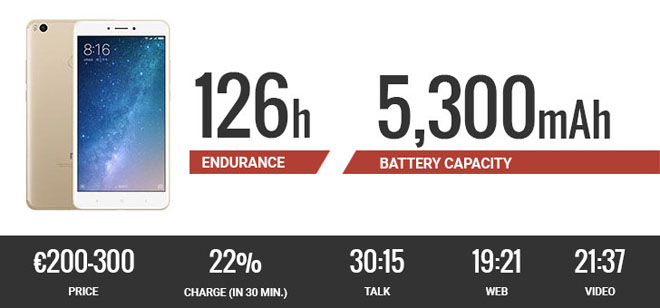 Theo bài test từ GSMArena, thời gian chờ tối đa mà Mi Max 2 đạt được là tới 126 giờ, xem phim liên tục trong gần 22h và thời gian đàm thoại kéo dài tới hơn 30 giờ. Chắc chắn với những thông số ấn tượng này, Mi Max 2 chắc chắn là chiếc smartphone bất chấp mọi nhu cầu của người dùng.