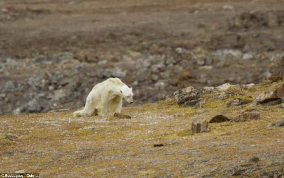 Trong cảnh phim đau lòng, con gấu gày guộc có thể được nhìn thấy đang nhặt tìm thức ăn, vấp ngã trên địa hình không hề có băng.
