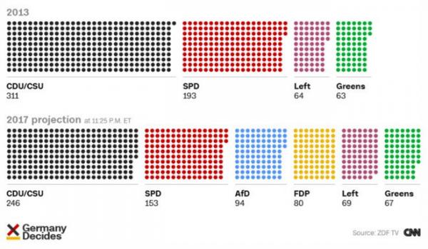 Số ghế của các đảng chính trị tại Hạ viện Đức sau cuộc bầu cử tháng 9/2017. Đồ họa: CNN.