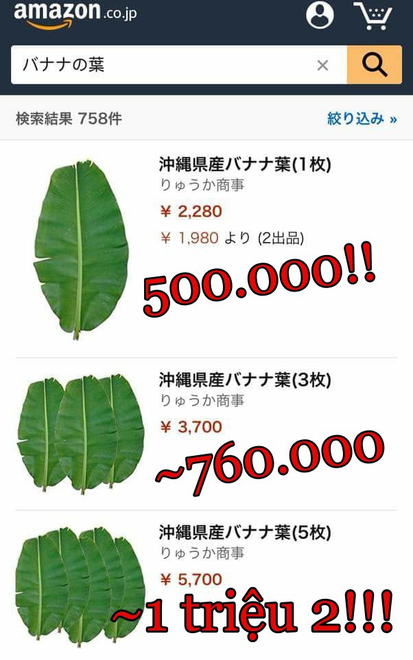 Một hình ảnh được lan truyền mới đây trên một fanpage đang khiến nhiều người Việt Nam hoang mang vô cùng. Bởi chiếc lá chuối tươi mà chúng ta thường được biết đến dùng để gói các loại bánh truyền thống, hay như dùng để xoè ô che nắng hay được sử dụng ở rất nhiều tình huống tế nhị khác... nay bỗng dưng lại được định giá đến cả nửa triệu trên Amazon Nhật Bản.