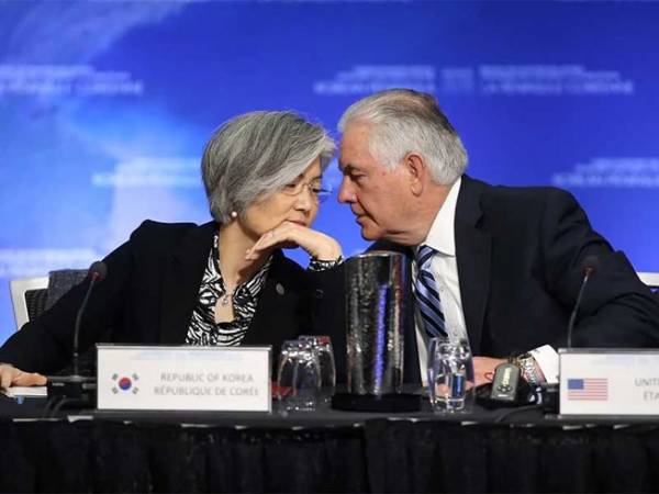 Ngoại trưởng Hàn Quốc Kang Kyung-wha và Ngoại trưởng Mỹ Rex Tillerson tại hội nghị về Triều Tiên ở Vancouver (Canada) ngày 16-1.