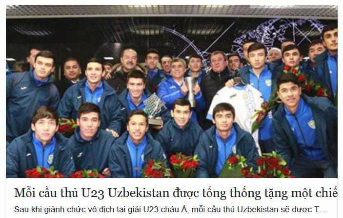 Trong khi các cầu thủ Uzbekitan được đích thân tổng thống ra tận sân bay đón, và tặng mỗi người một bó hoa hồng rất đẹp, được chụp ảnh với tổng thống, tổng thống nhường cho các em đứng trước, sau đó được về nhà nghỉ ngơi, hôm sau mới dự lễ chúc mừng thì các cầu thủ U23 VN phải đứng trên xe mấy tiếng đồng hồ, rồi phải vào lăng báo công với xác chết, xong lại phải gặp thủ tướng khệnh khạng, chụp ảnh thì phải nhường chỗ cho các vị lãnh đạo, sau đó lại phải ra sân vận động đến đêm mới được về, rồi gặp hết cơ quan này đến tỉnh kia.